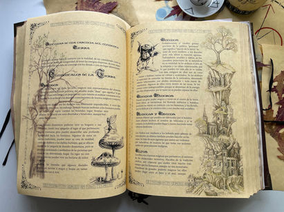 Designed to feel like an old grimoire, it blends traditional bookbinding with creative experimentation. Some pages feature my own sketches—like fae folk and ritual circles—while others incorporate unique materials such as personalized inks, salt, ash, and shells, adding texture and symbolism to the book. While some artwork is sourced to complement the aesthetic, every page is carefully curated to reflect my vision.